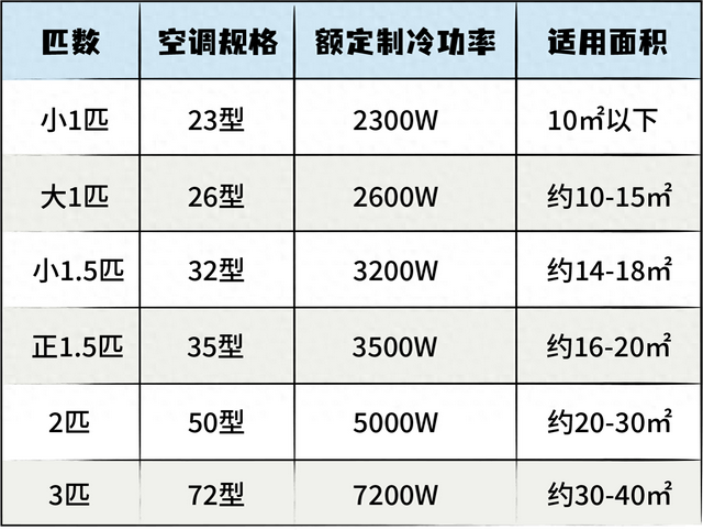 如果不想出现空调买大了浪费或者买小了不够用的情况,可以参考这张表↓